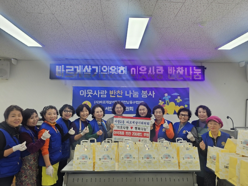 (e시민일보) 이유미 기자 = 인천시 남동구 서창2동 바르게살기운동위원회(위원장 김민정)는 최근 어려운 이웃을 위한 ‘사랑의 반찬 나눔’ 봉사활동을 진행했다고 12일 밝혔다.