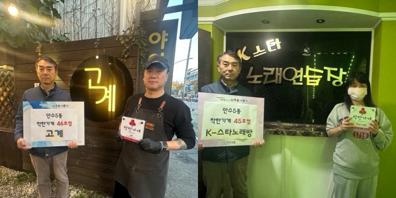 만수5동의 45, 46번째 착한가게 현판을 달게 된 두 가게의 대표들은 “지역에서 사업을 운영하며 받은 사랑을 조금이나마 돌려줄 수 있어 기쁘다”라고 말하며 “작은 나눔이지만 이웃들에게 희망과 행복이 전해지길 바란다”라고 전했다.