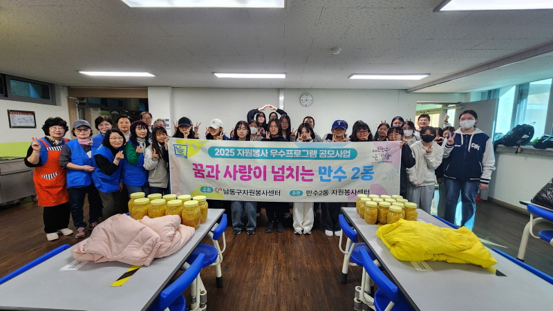 임덕명 동장은 “이번 경로당 어르신과 함께 건강사랑 수제청 만들기 사업에 참여한 만수2동 자원봉사단체 회원과 숭덕여고 학생들에게 감사드린다”라며 “앞으로도 더 많은 지역 주민이 참여하는 봉사활동으로 더불어 사는 지역사회를 만들기 위해 노력하겠다”라고 말했다.